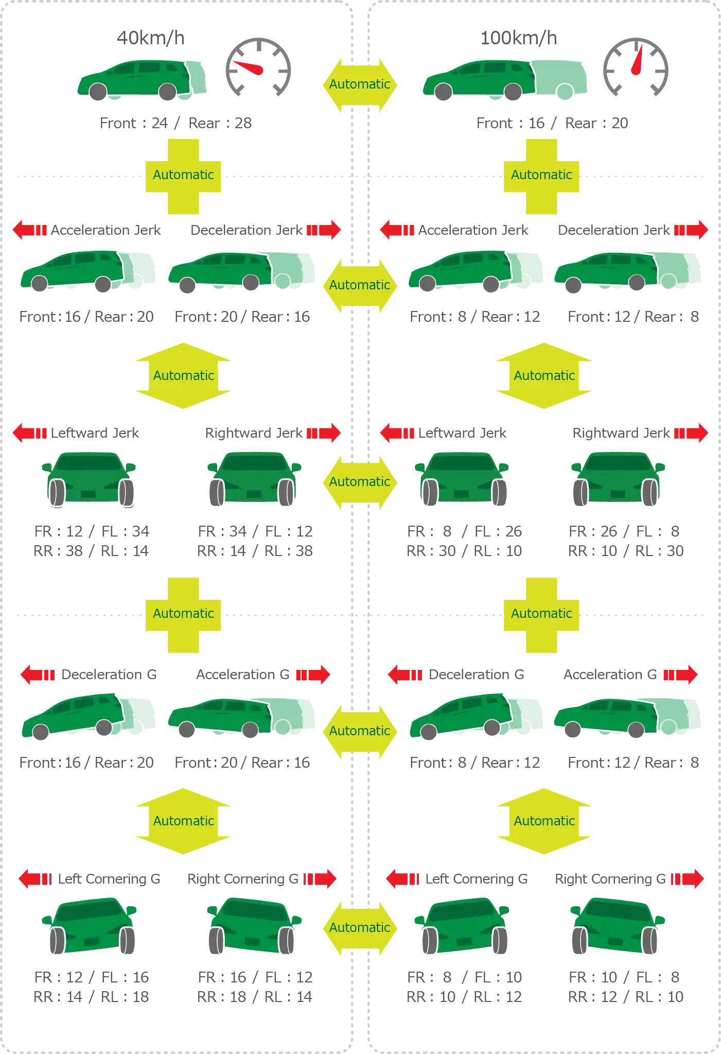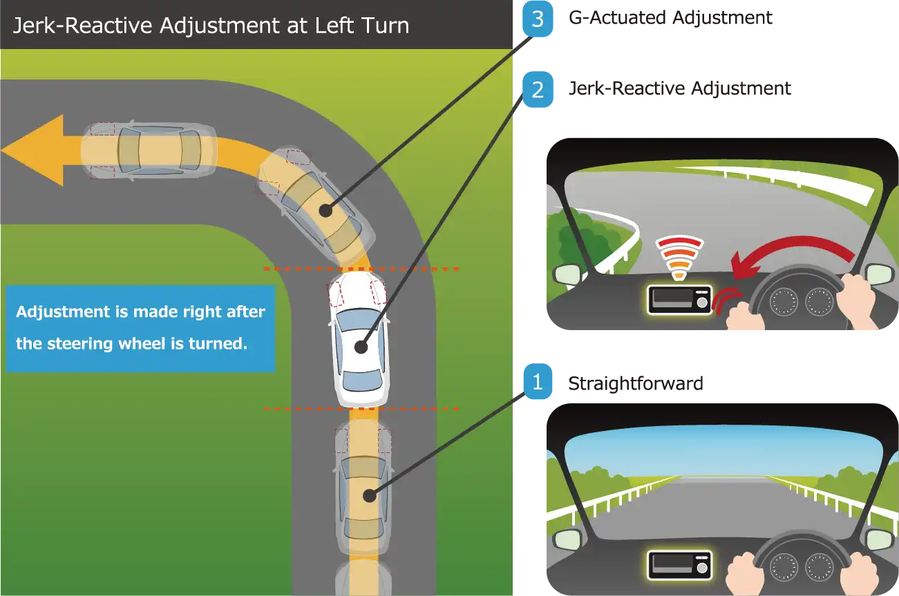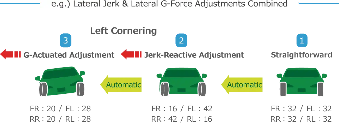 Poprzez obliczanie wskaźnika wstrząsu na podstawie zmian w wykrywanym przyspieszeniu G, dostosowanie może być dokonane automatycznie w momencie, gdy rozpoczyna się skręcanie, przyspieszanie lub zwalnianie. To umożliwia osiągnięcie dobrego balansu między ostrym prowadzeniem a komfortową jazdą.