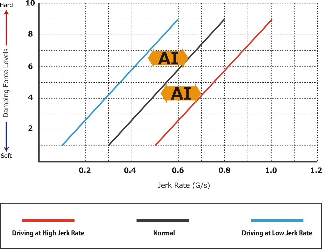 System uczy się zachowań kierowcy i kontroluje, jak dokonywana jest regulacja reaktywna na wstrząsy. Pojazd porusza się inaczej w różnych warunkach; od autostrad, przez ulice miejskie, kręte drogi, aż po tory wyścigowe. Sztuczna inteligencja działa, aby określić i zastosować najbardziej odpowiednie wzorce regulacji, eliminując uczucie dyskomfortu w różnych sytuacjach podczas jazdy.