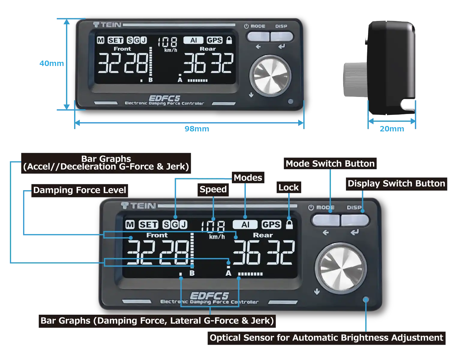 Dzięki wbudowanemu czujnikowi przeciążeń wzdłużnych a także bocznych twardość zawieszenia regulowana jest dynamicznie podczas jazdy. Centralka EDFC5 pozwala na wybór trybu zmiany ustawień twardości, która może odbywać się skokowo, lub płynnie.